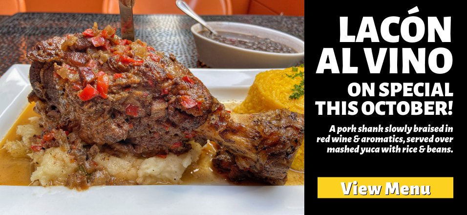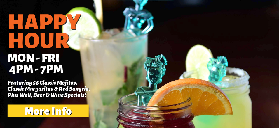 Relax and dine in while you enjoy Cuban refreshments, Mojitos, Margaritas, Sangrias, and live Latin music in one of our three locations, or take your drinks and Latin cuisine to-go back to the comfort of your home or hotel room. Take advantage of our Happy Hour drink specials Monday – Friday 4 pm – 7 pm.